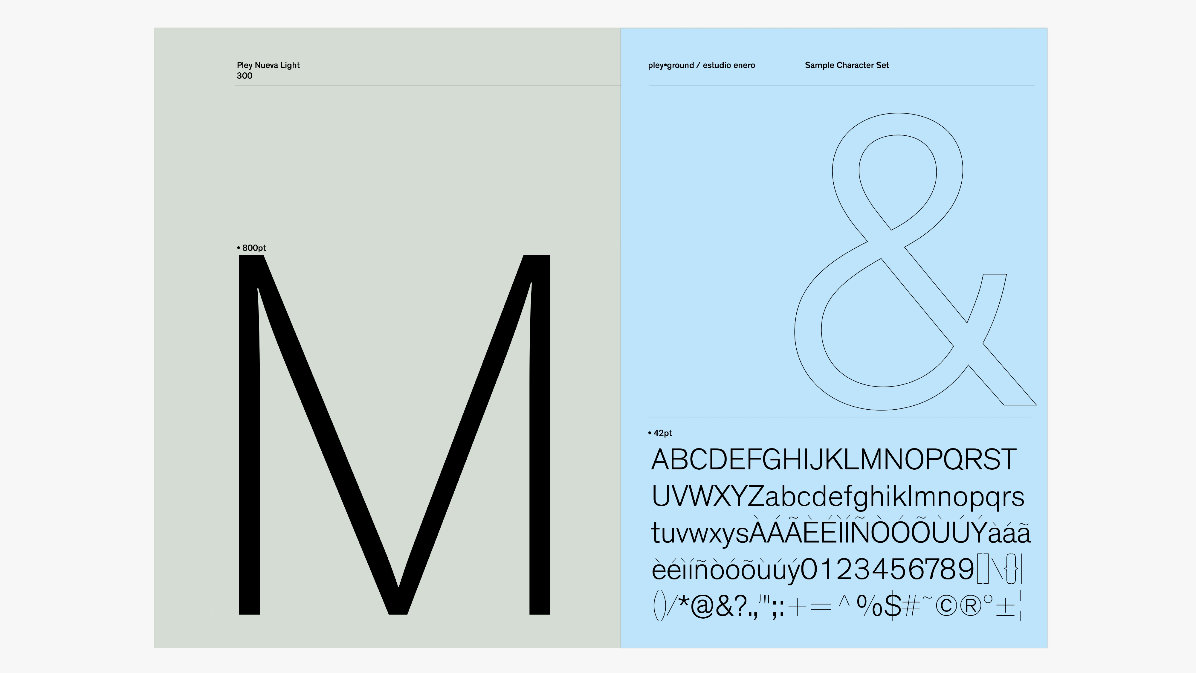 Pley Nueva is an extension and modernization of the official typeface of pley.ground (PG Pley Regular). We designed a modern sans serif whose flexible functionality allows it to be utilized as both a headline and for reading copy.