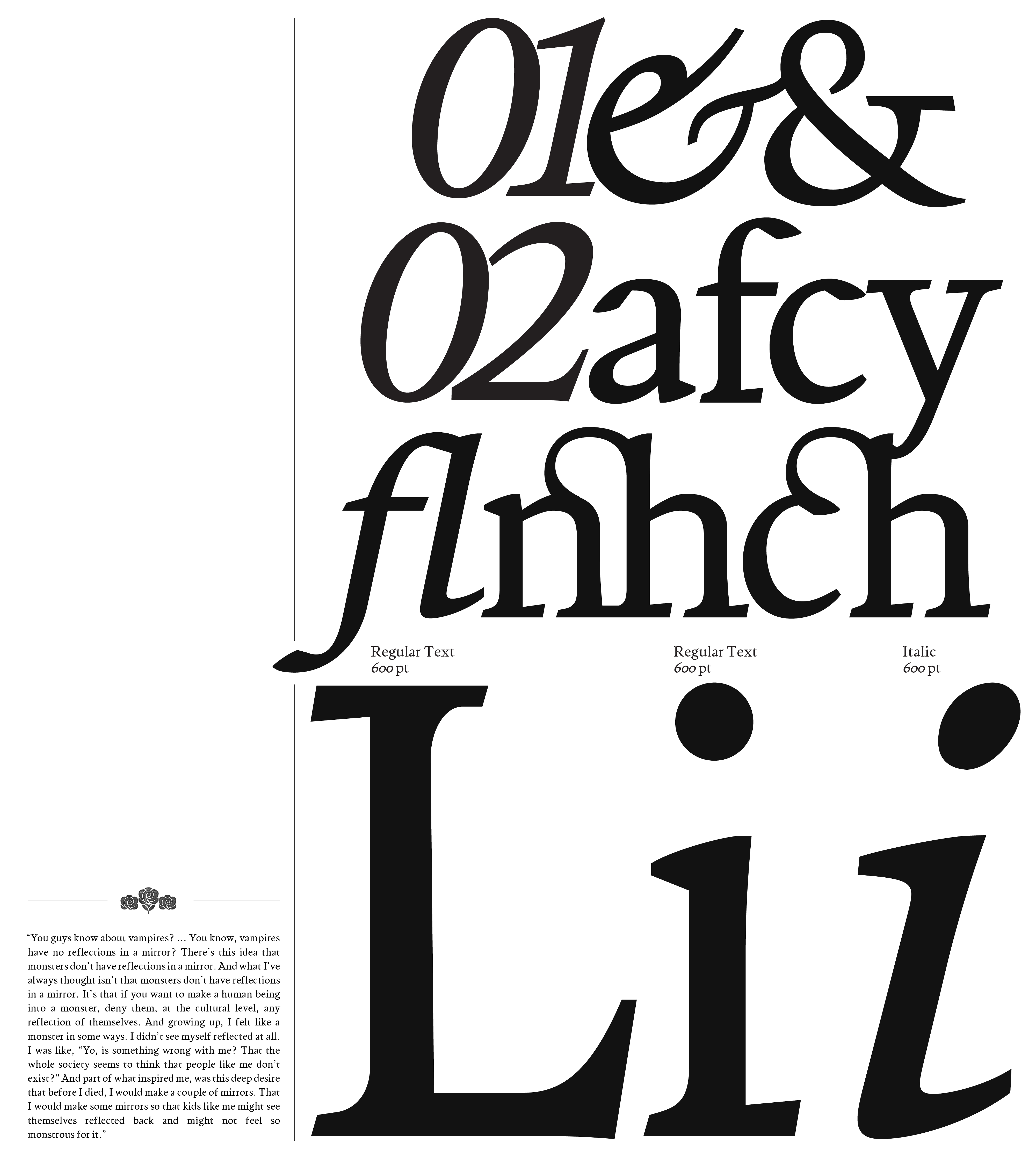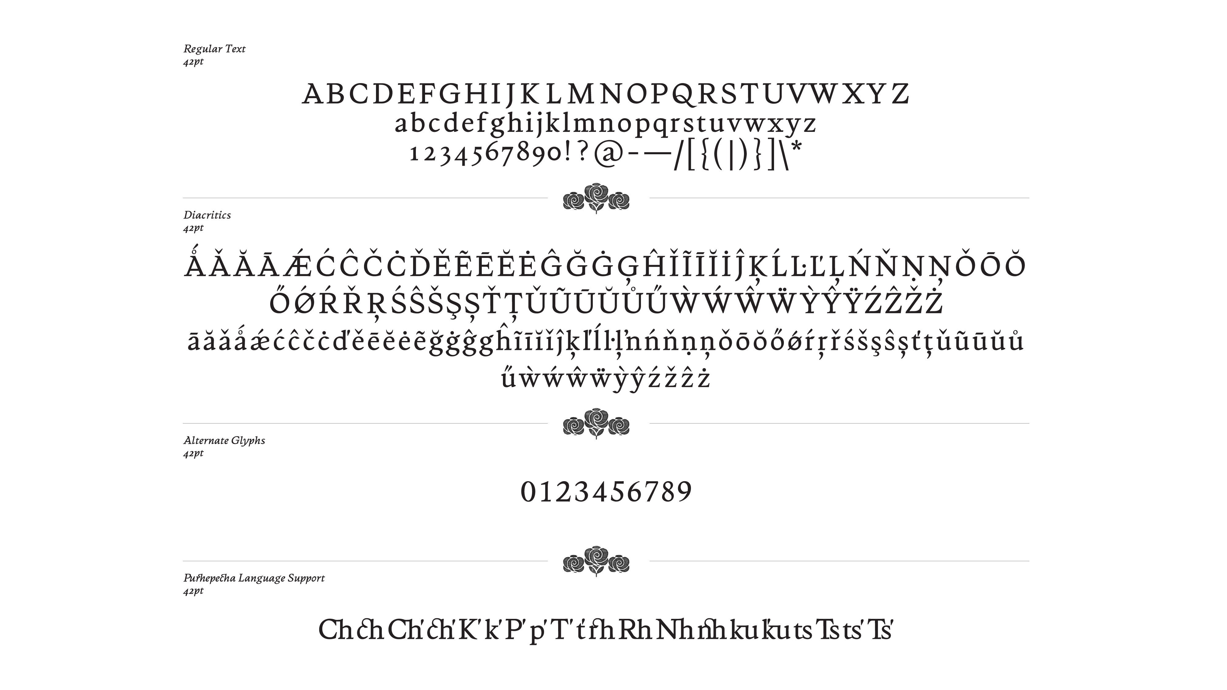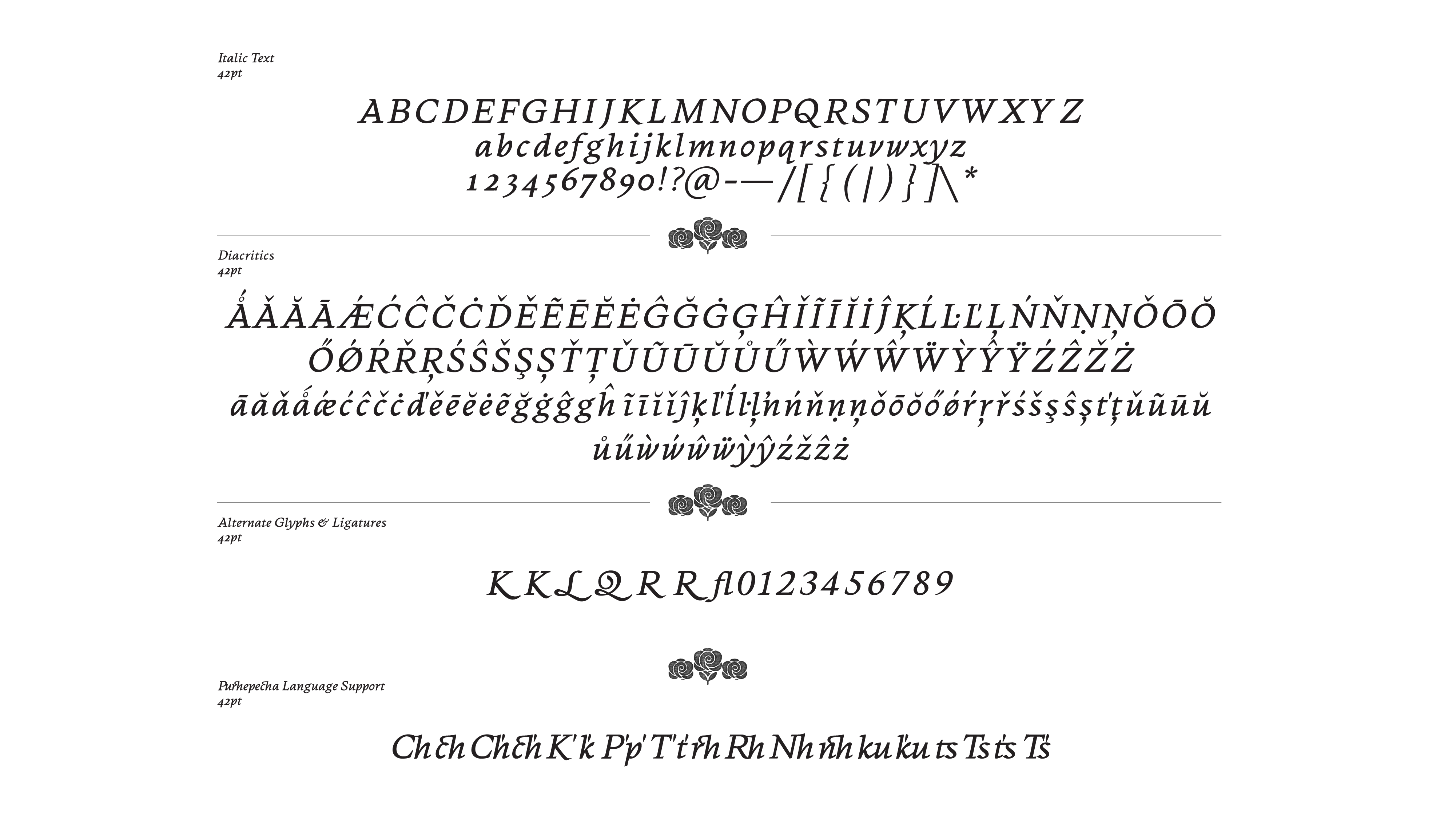 Intended to function as a legible text typeface for print, editorial and web usage, Tres Flores is a beautiful and timeless set of translation contrast letterforms bred from a set of photographs portraying multiple generations of my family who emigrated from Mexico and settled in the Central Valley of California. Tres Flores includes two styles, text and a fanciful italic in one weight. The typeface includes support for the Purepecha indigenous language, ornaments and playful alternates.